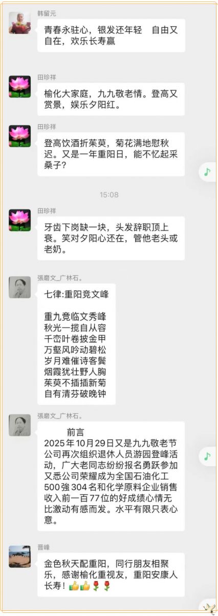 近午时分,暖阳疏洒,登高活动圆满结束,公司为退休职工送上了精心准备的重阳节纪念品。同事重逢的喜悦、登高赏秋的舒畅、歌声中流淌的深情,以及微信群里一首首诗句中的情怀,都化作秋日里最温暖的记忆。笑容洋溢在每一位退休职工脸上,这份温情,正是初心不改的最好见证。