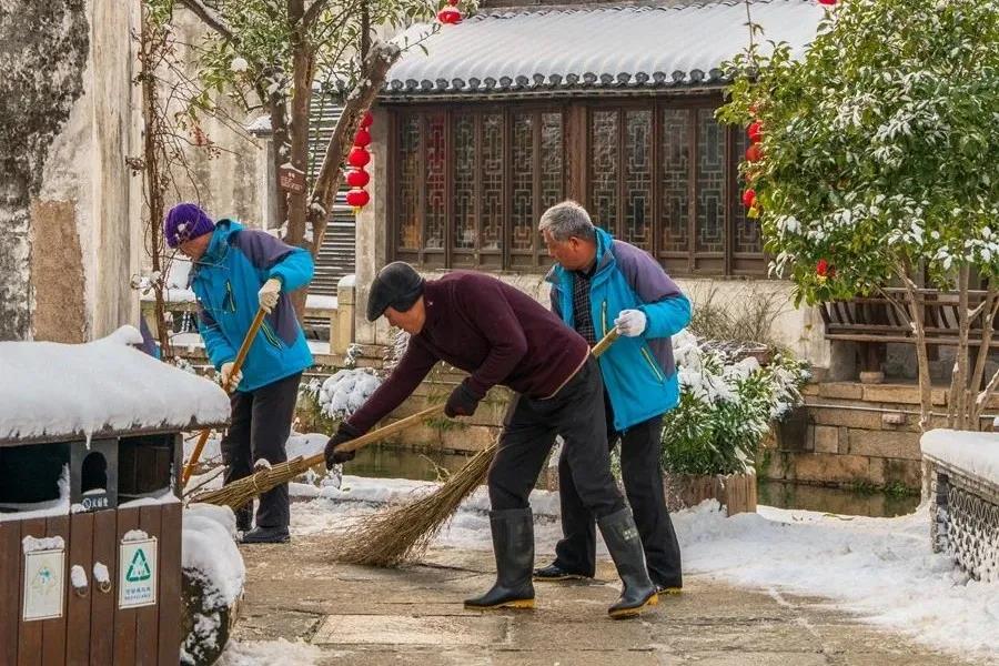 前几天早晨,拉开窗帘向外看,地上、树上、房顶上积满了雪。我把院子里扫出一条路后,准备先扫大门外和路上的雪,以方便自己及路过的邻居出行。走到大门外时,看见路上的大部分雪已被清扫干净,放眼望去,看见后排邻居那个六十多岁的大爷正在扫剩下的雪,当时我心里一阵感动,赶紧过去和大爷一起清除积雪。