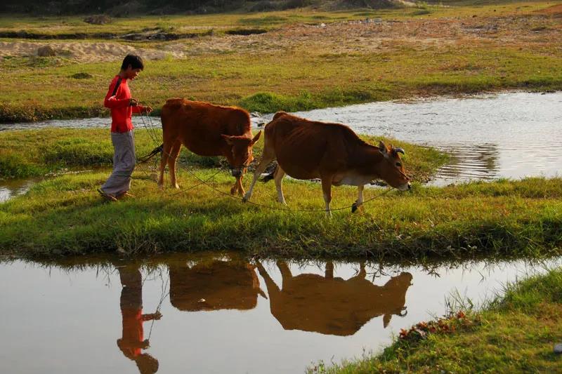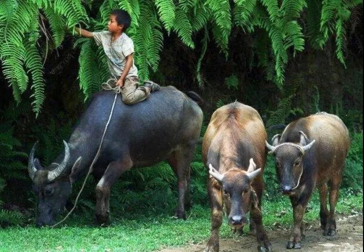 在我关于牛的记忆中还有一个非常特殊的桥段,我家喂养的那头母牛每隔一两年便会生下一个小牛犊(大部分小牛养个一年半载的就会被卖掉补贴家用),期间曾有一个小牛犊是在我小学放暑假期间生的,当时闲着无事的我,几乎每天一有时间就跑去看这头全身棕红的小牛,很快就和它建立起了无比亲密的关系。盛夏期间,我最爱去村东头的河里游泳摸鱼,在这条小河边,有我的欢乐,也有这头小牛的欢乐。每当我要去河边玩耍时,这头小牛就会摇头晃脑的紧跟着我,当我和伙伴们在河里自在的游泳嬉戏时,小牛则在岸边的草滩上往来飞奔,待我玩累上岸时,它又蹦跳着用它那光秃秃的脑袋冷不丁的把我顶入河中,然后扬起尾巴一溜烟跑远了,常常惹得和我一起的小伙伴们哈哈大笑又艳羡不已。在我的坚持下,这头小牛在我家足足待了三年有余,后来由于父亲腿疼的厉害,不得不将大牛和小牛一块卖掉了,为此我曾伤心了好长一段时间。