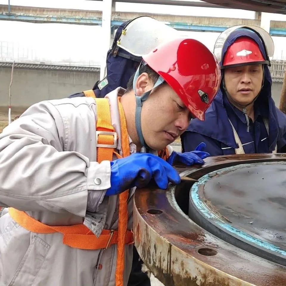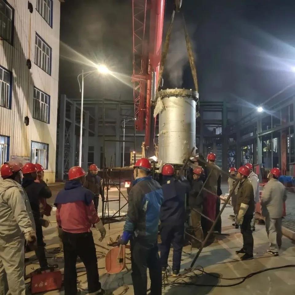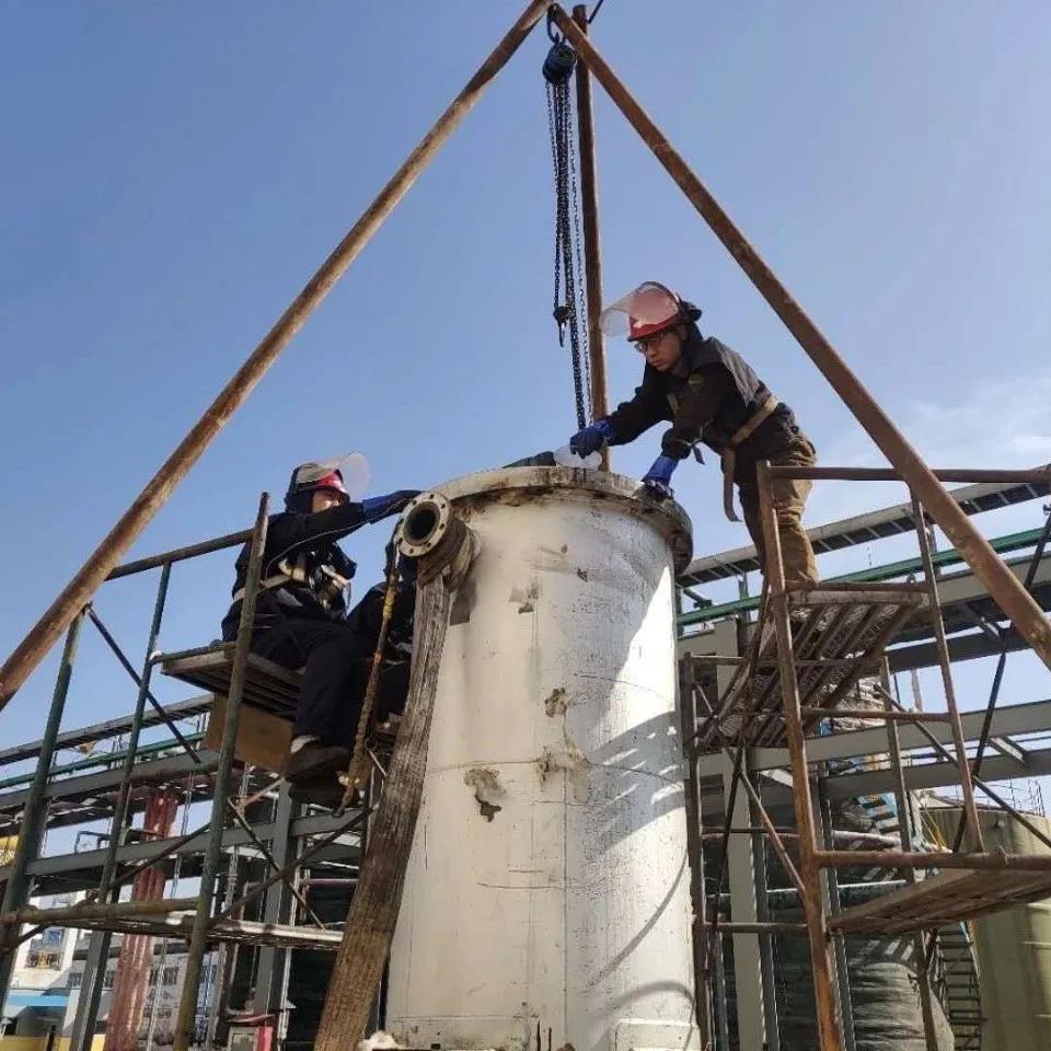 我厂所用的关键设备多为进口设备,使用最多的就是上海贤达梅尔森过程设备有限公司生产的进口石墨换热器,其价格也是最为昂贵的一种。2020年2月28日大夜班操作工在巡检中发现蒸馏A塔石墨换器底座有渗漏现象,并及时报告班长、调度及值班干部。这台设备出厂价高达110万元,即使返厂维修也需要12万元之多,维修周期也需要10-15天,不仅维修费用高,且正值疫情期间,维修时间难以保障,经厂部会议讨论决定,自主对石墨换热器进行检查维修。如果自主维修取得成功,不仅可以节省高昂的维修费用,还能极大的缩短维修周期,及时保障系统正常运行,也进一步增强检修人员的检修经验水平。次日9时整,在岳厂长的亲自指挥下,检修工作开始有条不紊的进行,电、仪、焊、钳分工明确。因为是首次检修此类设备,对内部结构不是特别了解,所以检修工作相当于是在摸索中前进,对不懂的问题及时请教厂家技术人员或查找相关资料。晚上22时,经现场打压试漏,终于完成对换热器的拆检维修,运行指标稳定正常。在整个过程中全体干部紧盯安全、票证、质量、进度四个工作要求,敢于创新,攻坚克难。这次检修工作,开创了我厂自主维修进口设备的先河,干部员工积累了丰富的工作经验,到目前为止通过类似的检修工作,直接节省维修费用超30万元。