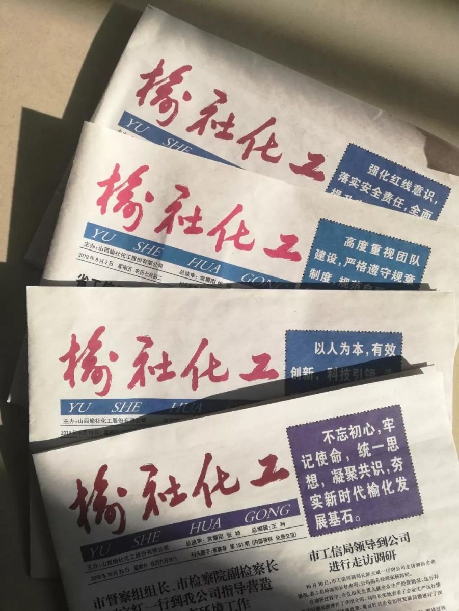 《榆社化工报》创刊于2004年2月23日,该报创刊之初,公司本着科学兴企、文化兴企的原则,旨在引导和约束员工遵章守纪并向着企业所制定目标的航灯前行,同时也是丰富员工文化生活的精神“食粮”。榆化报曾开办了班组建设、一线采风、艺苑、企业动态、科技交流与研讨、安全与质量论坛、调度会吹风、新闻集锦等栏目,外聘《山西画报》社主编陈茂林同志担任总编辑,由当时的五大分厂化肥厂、电化厂、热电厂、树脂厂、化机厂和办公室、秘书处、财务、保卫及榆化宾馆等机关科室选派20余名通讯员共同开展工作。该报历时15年8个月,最后一期报纸发行于2019年10月26日,共计发行181期。