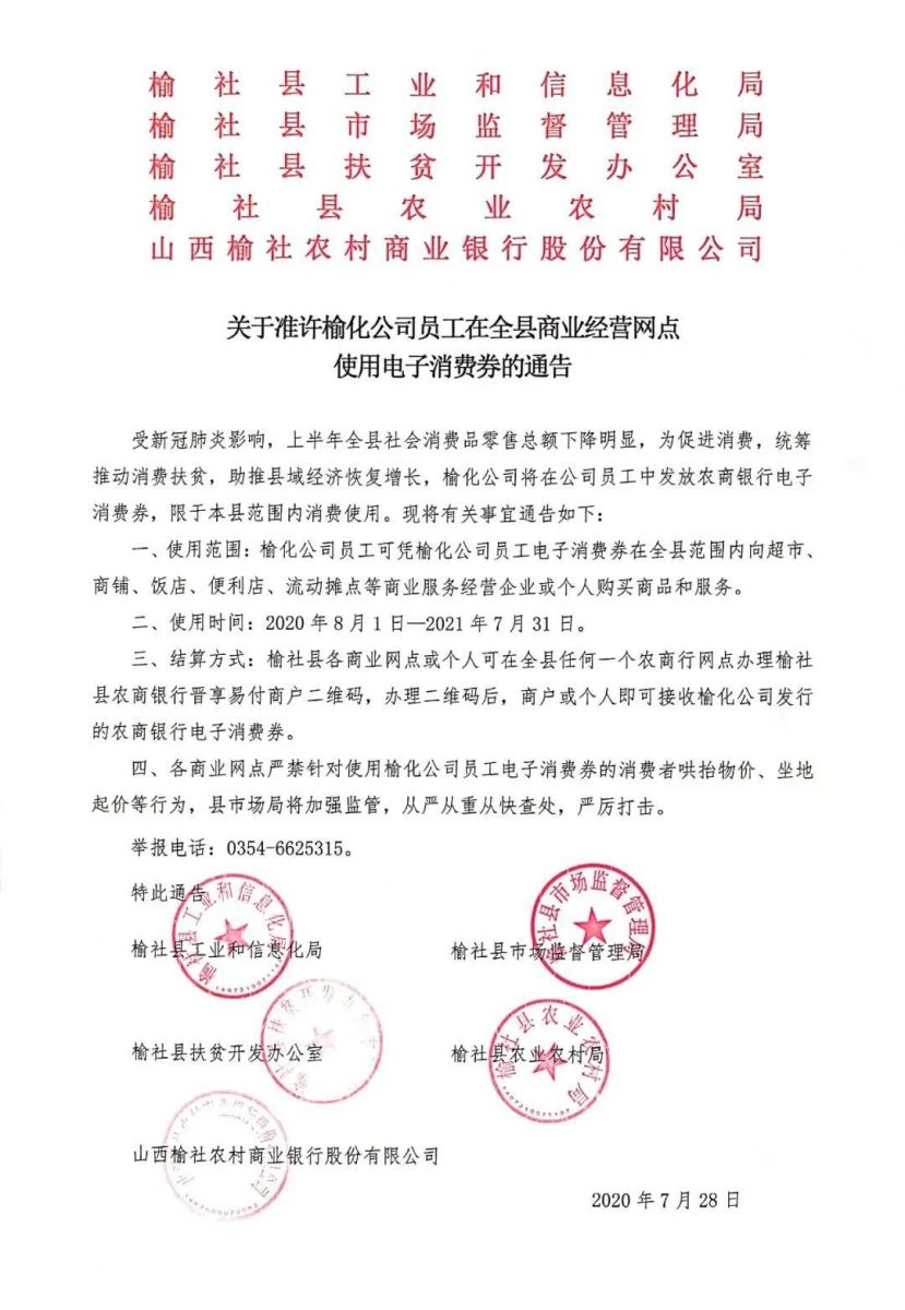 7月26日,榆化电子消费券率先通过52名在岗年薪制干部进行试用;8月18日,榆化电子消费券正式进入榆社市场。