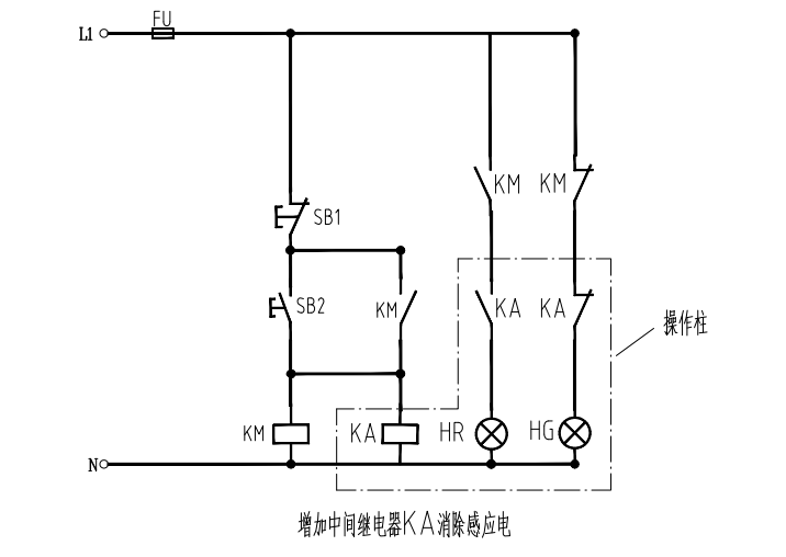 5、在操作柱内安装一个中间继电器对感应电进行有效隔离,通过继电器的常开常闭触点控制设备的启停指示灯(如图所示),感应发亮现象可有效避免。
