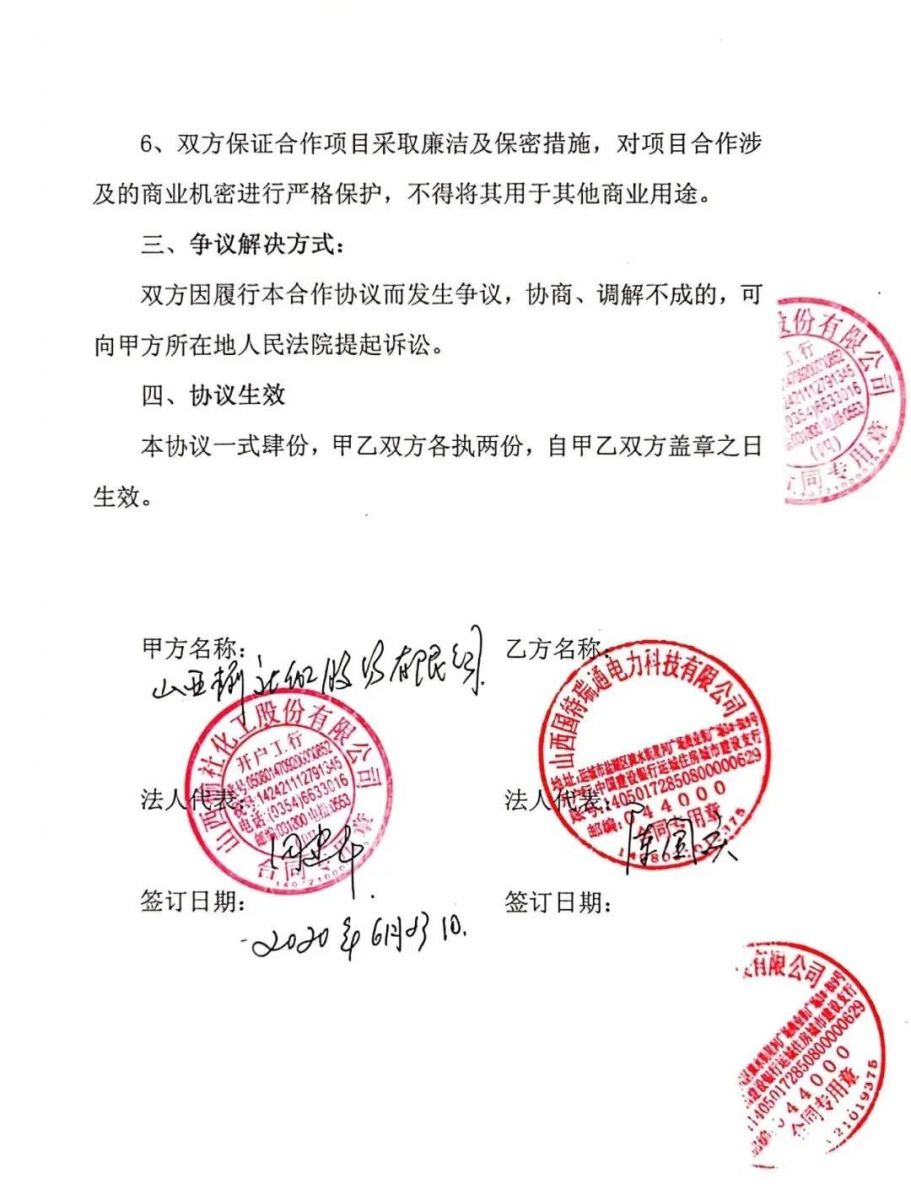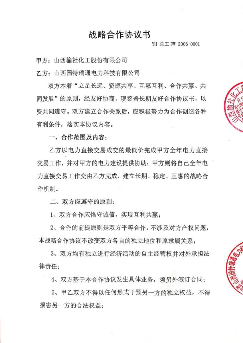 合约的主要内容为山西国特瑞通电力科技有限公司以电力直接交易成交的最低价完成我公司全年电力直接交易工作,并对我公司的电力建设提供协助;我公司则将自己全年电力直接交易工作交由山西国特瑞通电力科技有限公司,建立长期、稳定、互惠的战略合作机制。