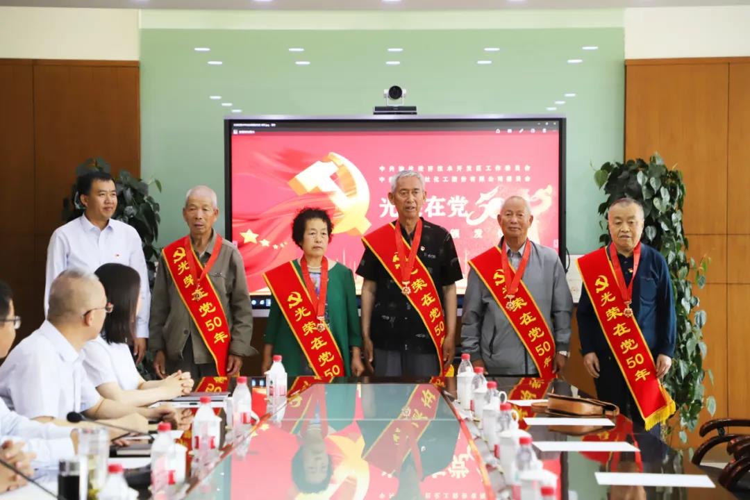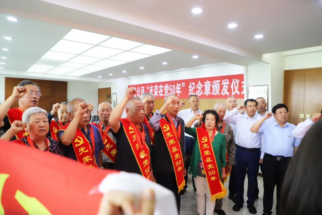 仪式在雄壮的国歌声中开始,公司党委副书记郜建军、开发区党工委书记王卫东为10名党员代表颁发了纪念章,并对获得纪念章的老党员表示热烈祝贺。获得纪念章的老党员们进行了交流发言,在场党员一起重温了入党誓词。
