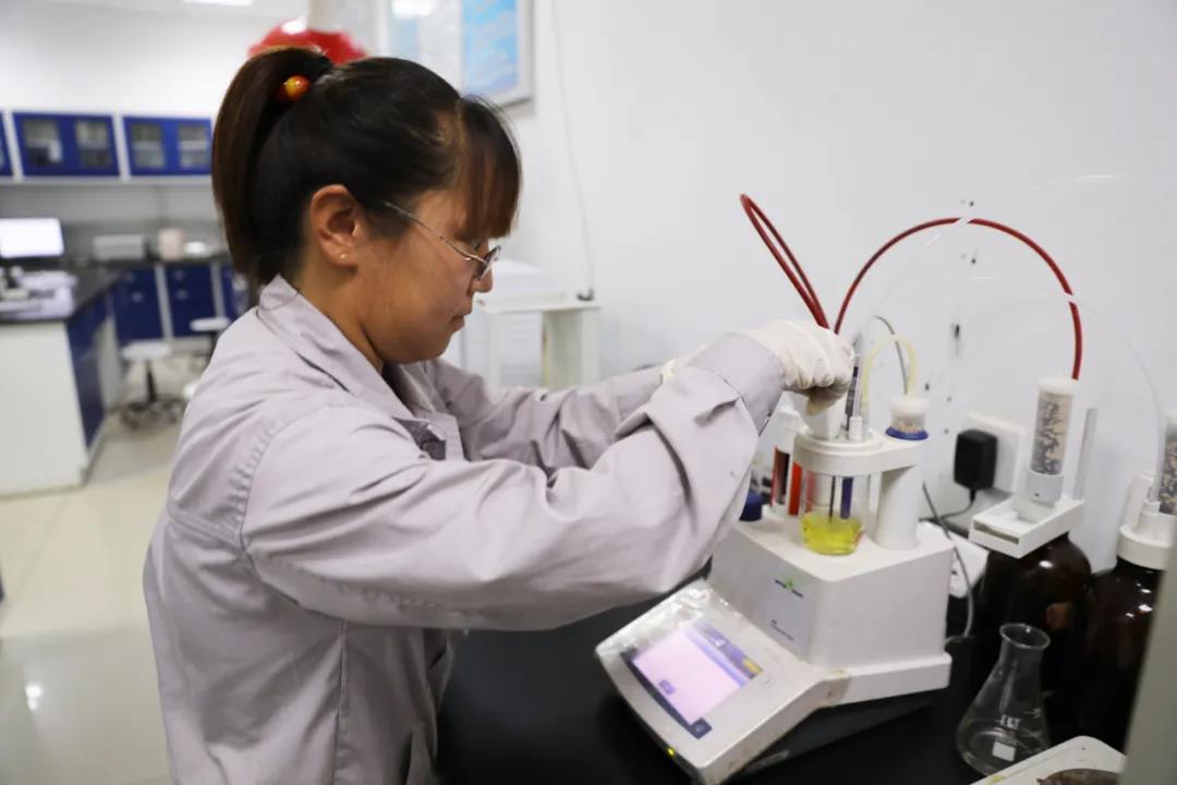 精细化工厂员工正在做氯乙酸成品中的水分分析