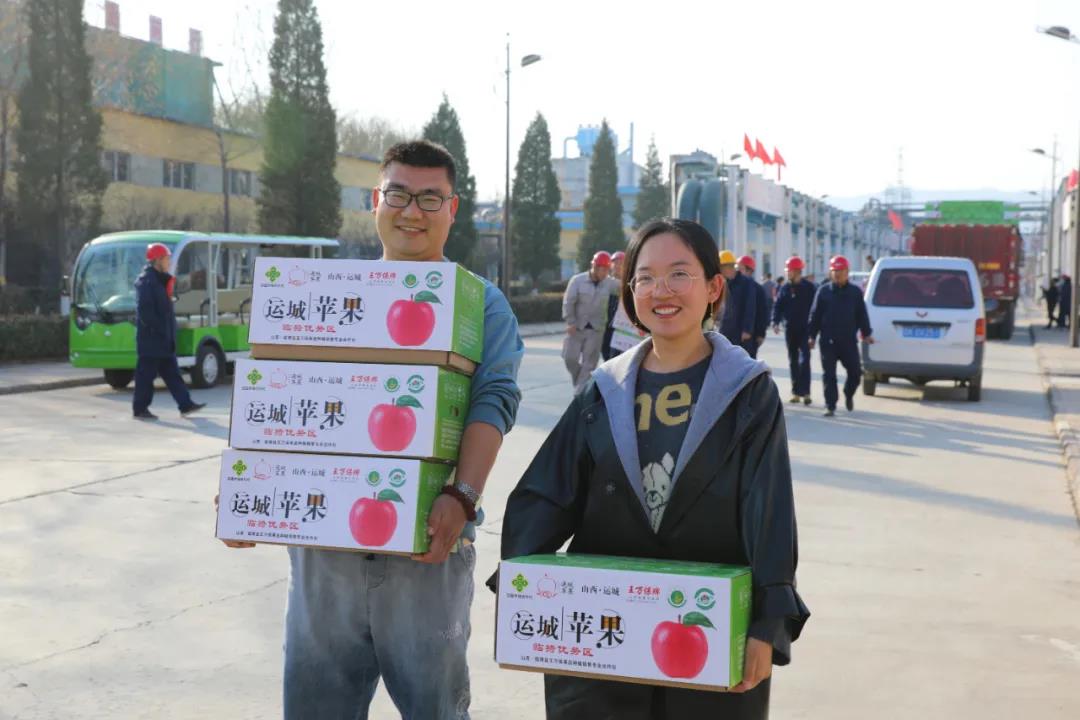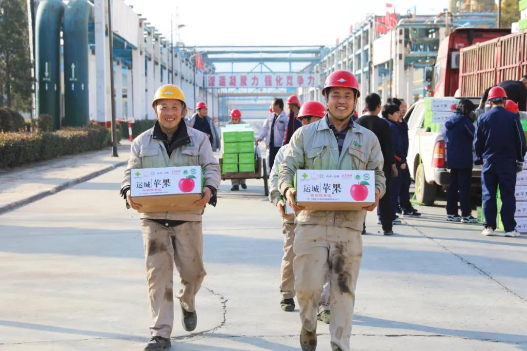 车上整齐码放的一箱箱苹果在各单位有序安排和齐心协力传递中卸下。现场人员配合默契,一箱箱红彤彤的苹果陆续发放到员工手中,欢声笑语的打趣声、手捧肩扛的场景热闹非凡。