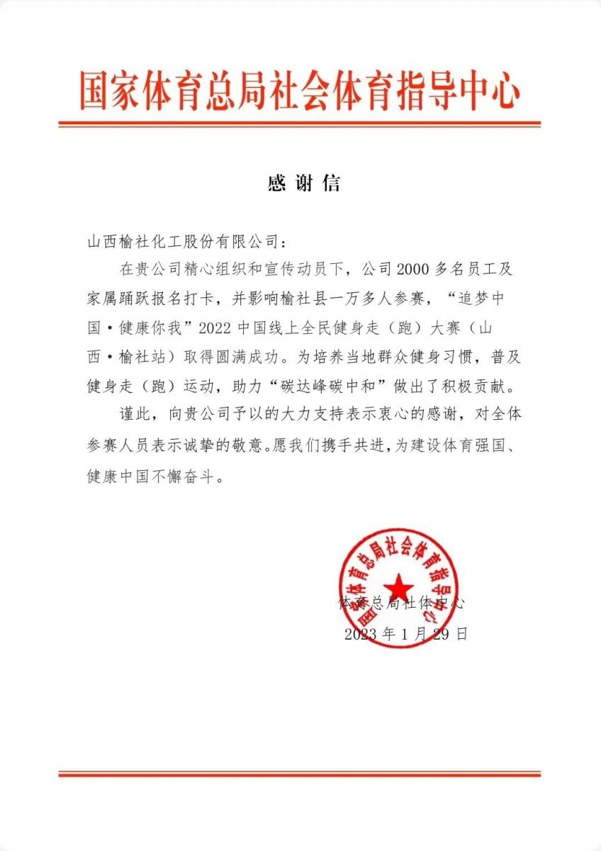 这封带着温度的感谢信,是对健康榆化建设的肯定,也是对榆化人健康生活的点赞。近年来,公司积极响应国家全民健身号召,修缮职工篮球场、羽毛球场地,新建职工健身馆等,为员工提供良好的运动健身条件;举办篮球赛、拔河赛等赛事,组织榆化拔河队参加省、市、县拔河争霸赛,并取得优异成绩;开展全员体能测试、越野达标、健身达标等活动,促进员工关注体重指数、血压、心率等身体指标,引导员工培养健康的生活方式,为好博在线(中国)注入健康、文明、自律的新内涵。健康榆化为榆化人的幸福“加码”。