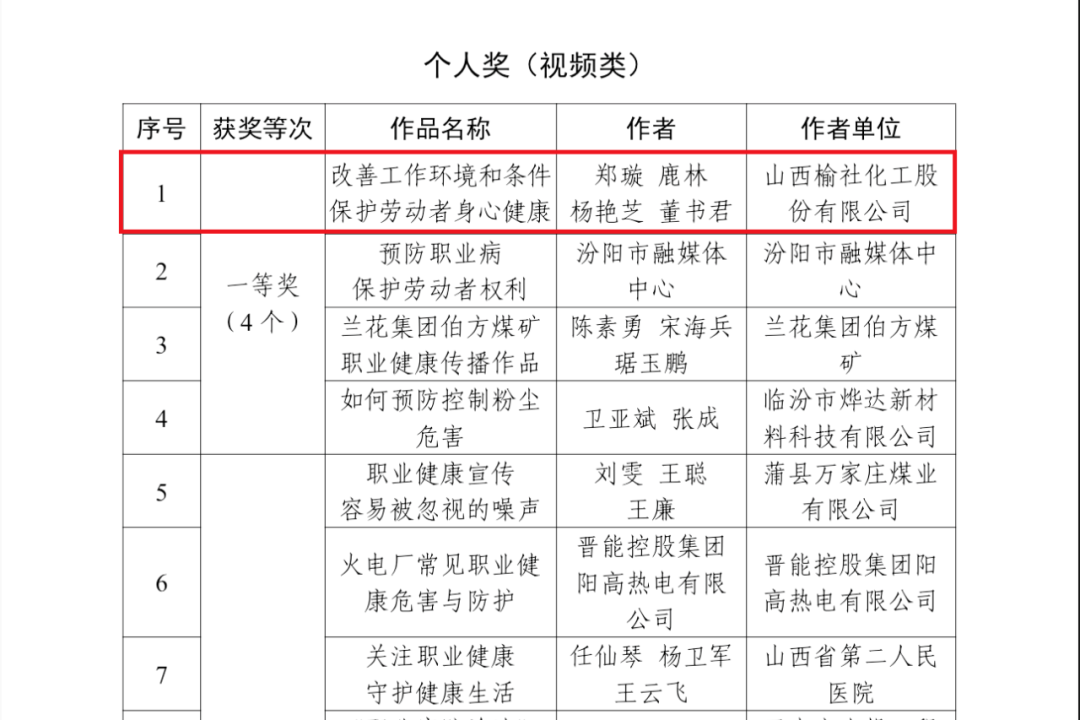 公司综合办公室宣传科视频类短片《改善工作环境和条件 保护劳动者身心健康》在全省第三届职业健康传播作品征集活动省级评选中获得个人奖(视频类)一等奖第一名。公司《改善工作环境和条件 保护劳动者身心健康》结合企业实际,从公司职业健康防护各项规章制度、设备设施、人文生态环境建设及专项培训等方面切入主题,内容丰富,制作用心,体现了企业“一切为了劳动者健康的宗旨”,传播了职业健康知识,倡导了健康工作方式,展现出新时代劳动者的健康形象和良好风貌。