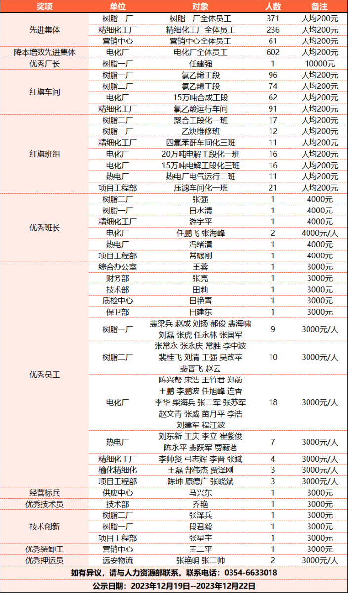依据《榆化公司2023年度表彰奖励的通知》要求,结合各单位推选出的先进个人,2023年度共评选出先进集体3个、降本增效先进集体1个、优秀厂长1名、红旗车间4个、红旗班组7个、优秀班长7名、优秀员工59名、经营标兵1名、优秀技术员1名、技术创新3名、优秀装卸工1名、优秀押运员2名。