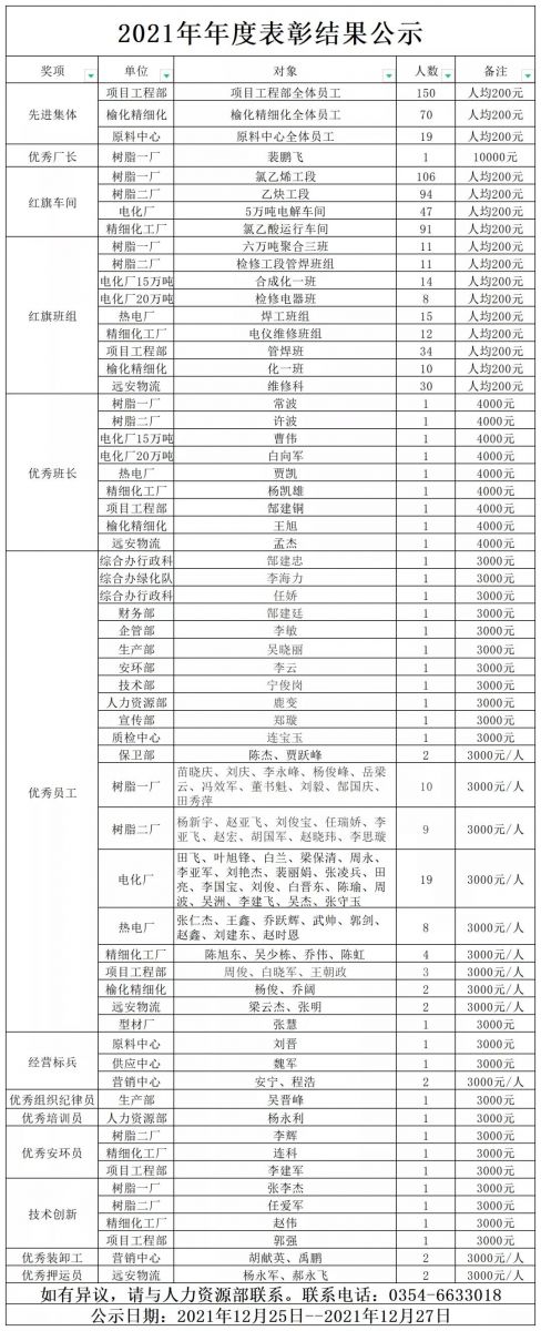 结合各单位推选出的先进个人,2021年度共计表彰先进集体3个,红旗车间4个,红旗班组9个,先进个人98名。