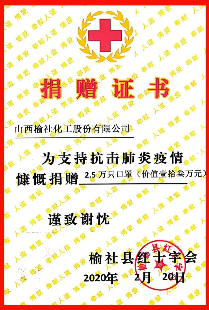 榆社县红十字会负责人表示:“非常感谢榆化公司慷慨捐赠疫情防控期间最紧缺的防疫用品,2.5万只口罩如同雪中送炭,给榆社疫情防控工作提供了莫大支持”。