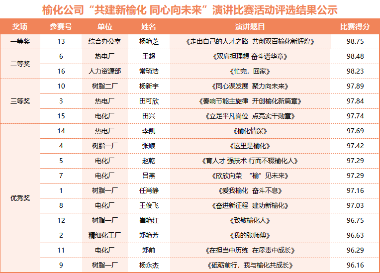 比赛现场,精彩纷呈,《走出自己的人才之路 共创双百榆化新辉煌》 《双肩担理想 奋斗谱华章》 《忙完,回家》……16名选手轮番上台,以小故事反映大主题,从不同岗位、不同视角,紧紧围绕“共建新榆化 同心向未来”这一主题,以小见大、以情动人。他们时而铿锵有力、激荡人心,时而温柔婉约、触动心灵,用朴实的语言、鲜活的事例和真挚的情感,声情并茂地讲述了“身边人”在平凡岗位上履职尽责、担当奉献的“身边事”,描绘出一幅幅激情壮阔的画面、一幕幕感人至深的场面、一帧帧拼搏向上的画卷,展现了榆化人爱岗敬业、无私奉献、勇挑重担、善作善成的良好精神风貌,抒发了对榆化的无限热爱,深深感染着现场每一位观众。