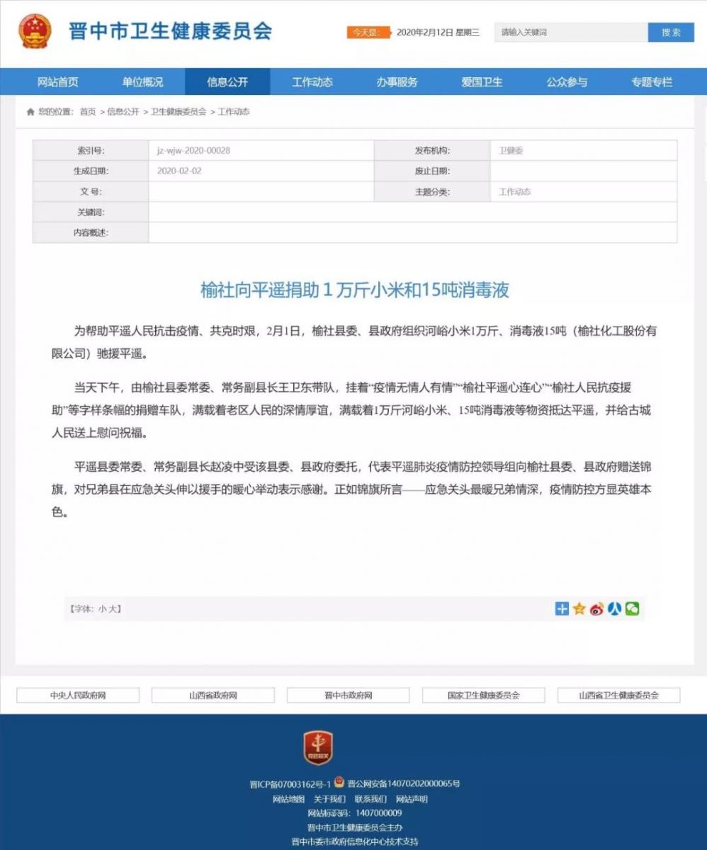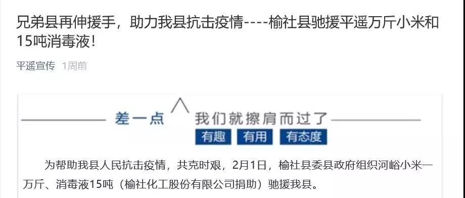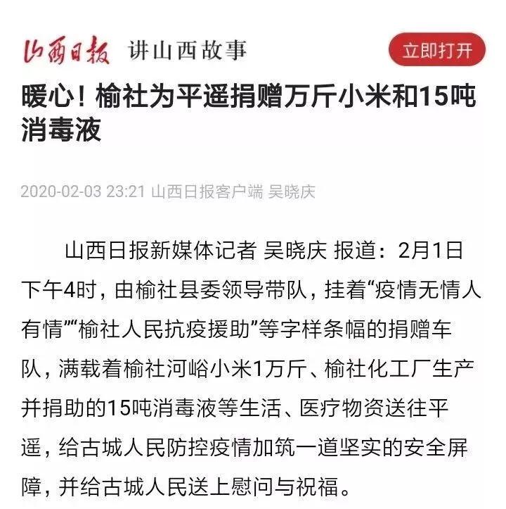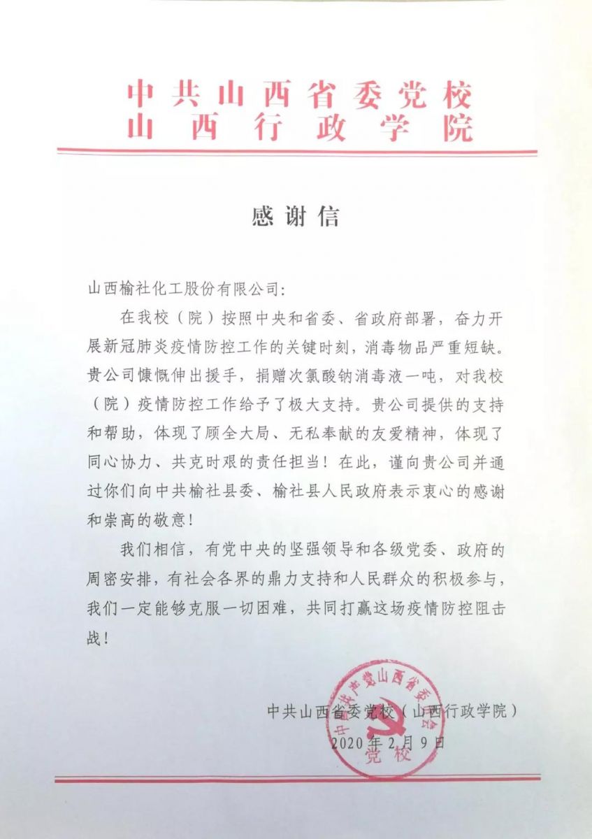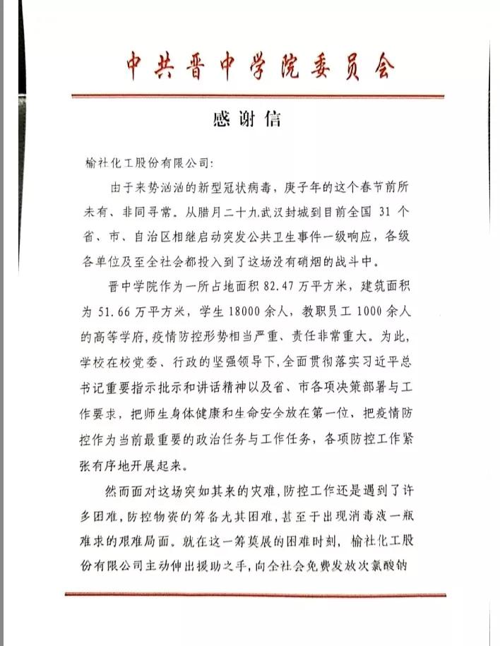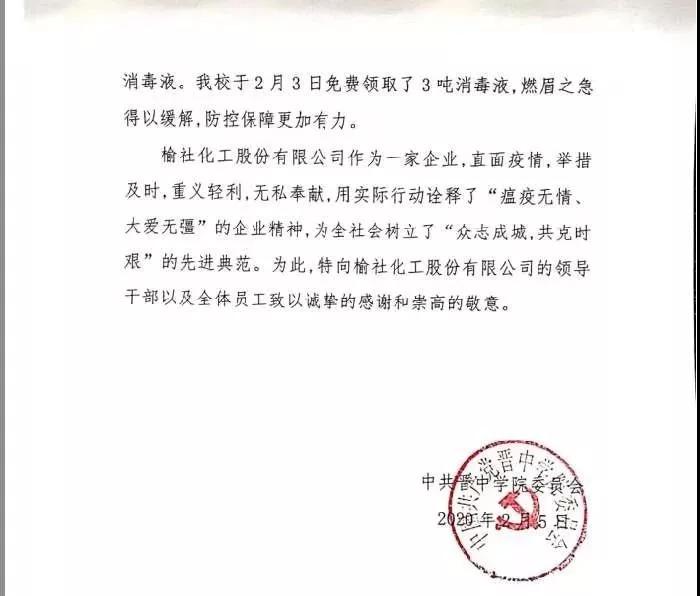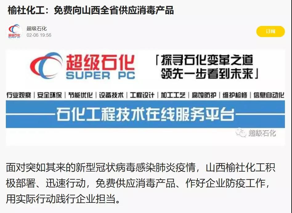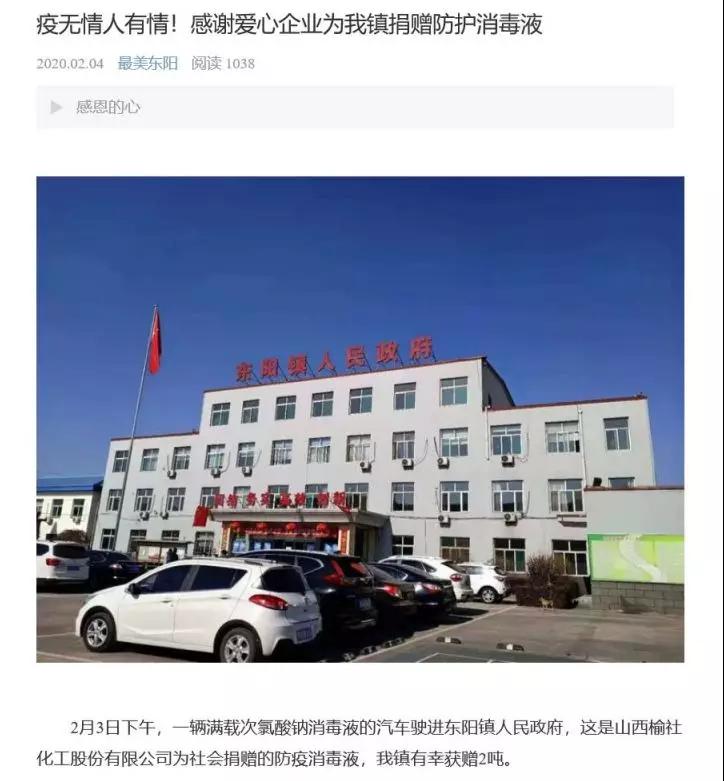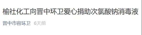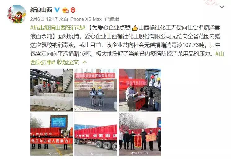 疫情无情,人间有爱。榆化公司于1月31日——2月11日共计为全省范围内357家单位捐赠次氯酸钠消毒液163.545吨。社会各界纷纷对榆化所为表示感谢,晋中市卫生健康委员会、山西日报、晋中市交通运输局、晋中市工商联合会、新浪山西官媒纷纷发文对公司做出的义举表示肯定。